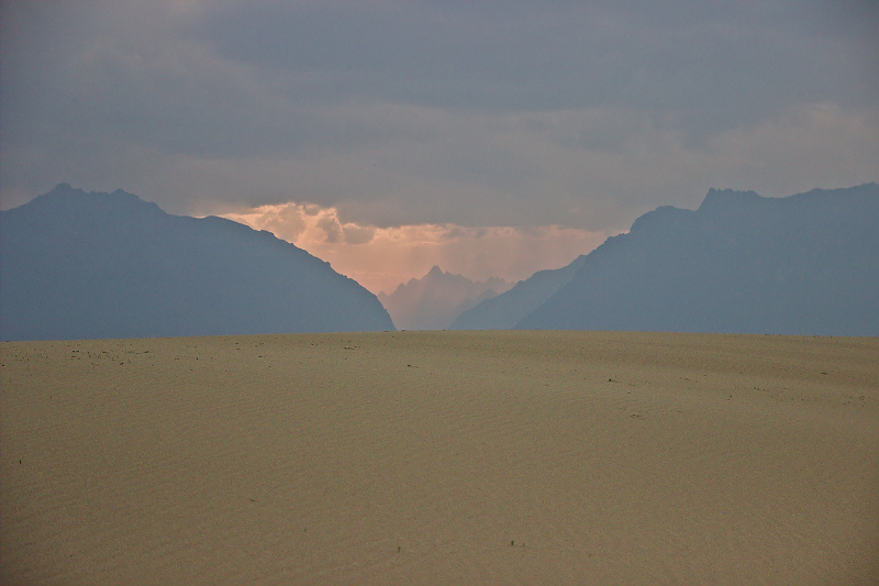 Маша разболелась от питья холодной воды и купания, и осталась отдыхать в палатке. Мы с Мариной ещё раз сходили до ближайшего песчаного бархана. Сегодня дым с гор чуть-чуть рассеялся и стало видно очертания гор.