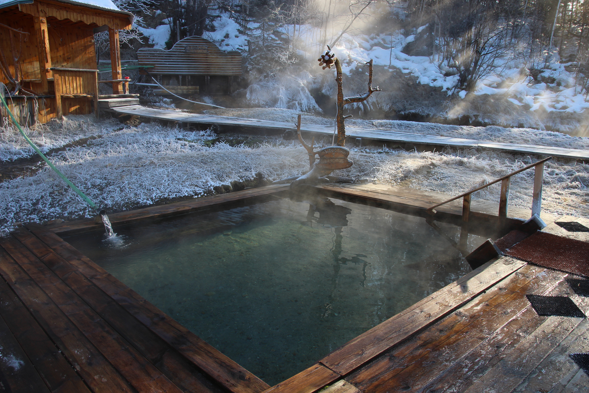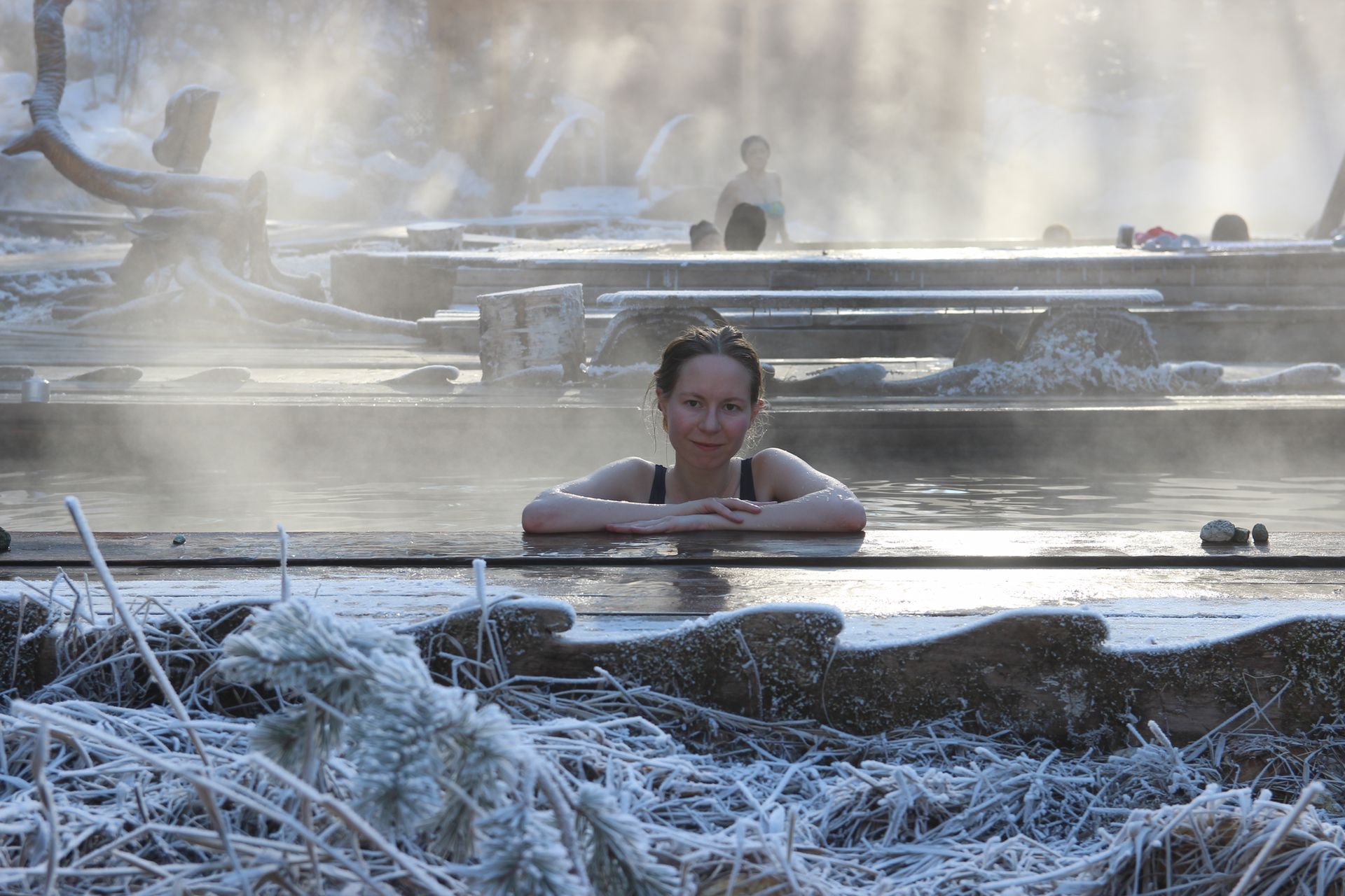 Самая главная тема — горячие источники. Первый день строился по принципу — ходим купаться, потом кушать и отдыхать, потом опять купаться. Утром, когда воздух самый холодный, на замёрзшую траву вокруг от горячего ручья выпадает иней. В лучах восходящего солнца всё вокруг окрашивается в нежные цвета. Это лучшее время для небольшой личной фотосессии.