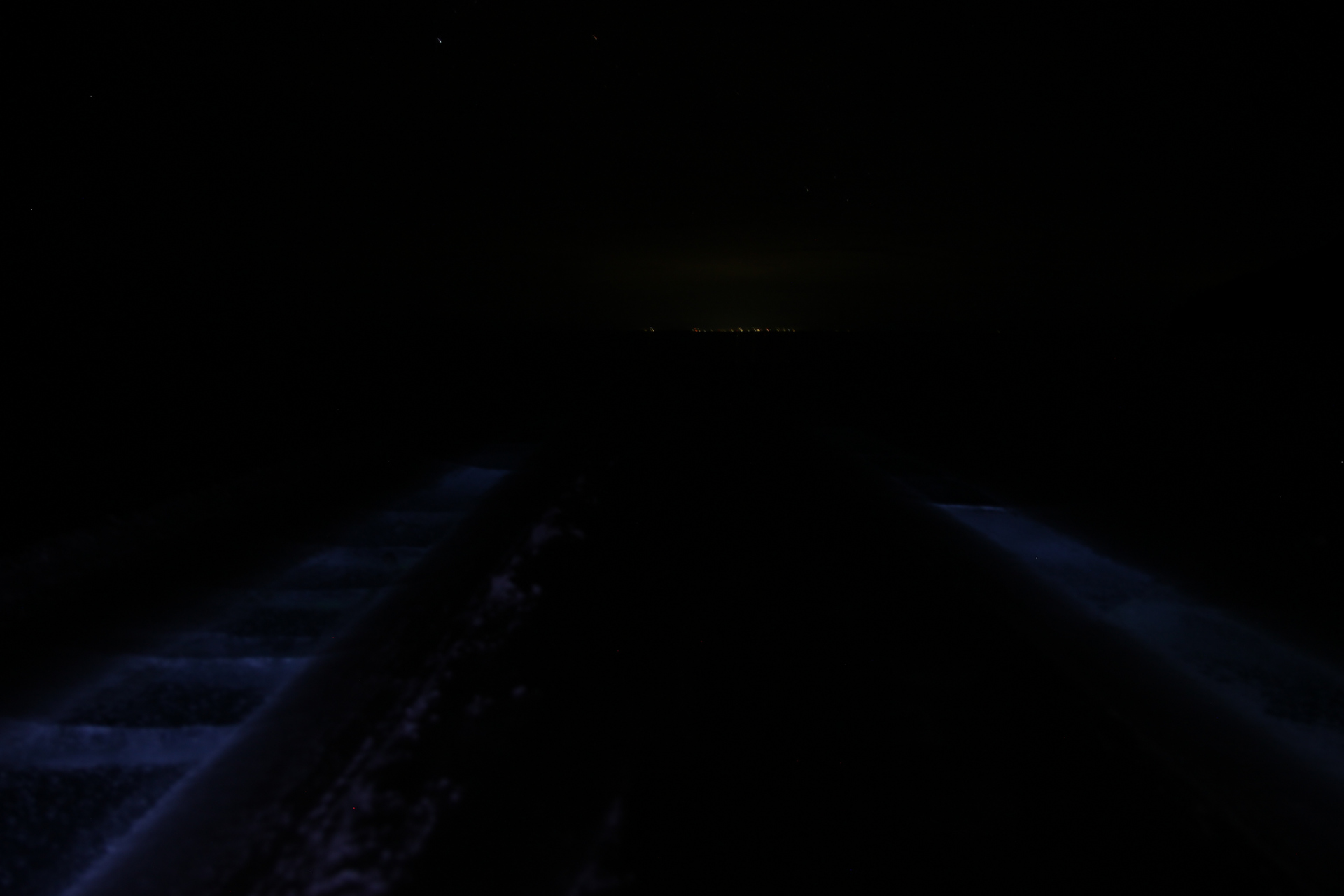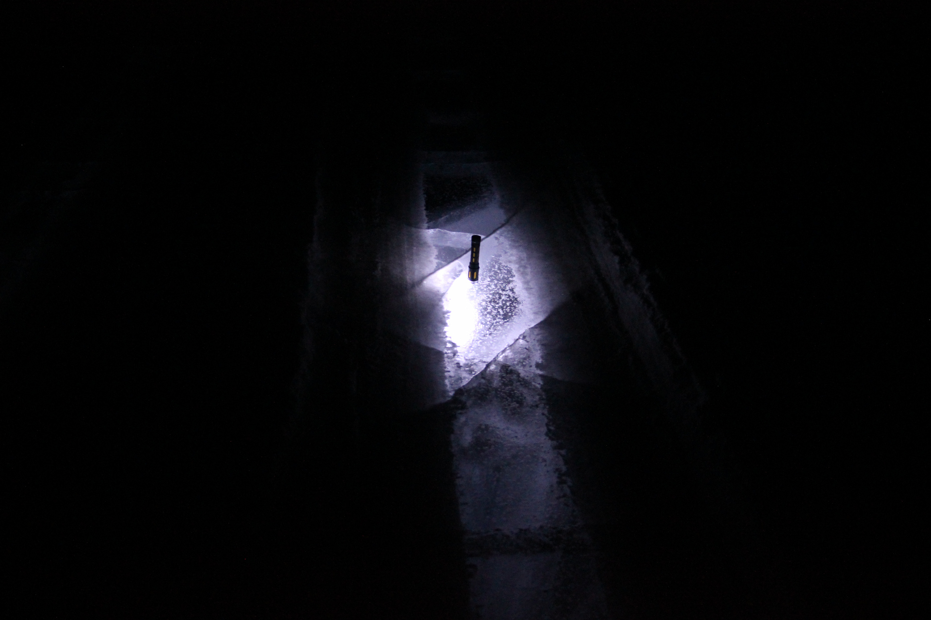 Во время ночной прогулки по берегу мы с Машей оказались на дороге в таком месте, где машины прокатали дорогу до льда. Естественно что у каждого в руках было по фонарику. Положив один фонарик на лёд лампочкой вниз получился ещё один интересный эффект — лёд вокруг в ночной темноте подсветился голубым светом. Хорошо что у нас во время этой прогулки был с собой фотоаппарат. Получилось сделать ещё несколько кадров магии света.