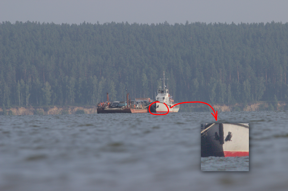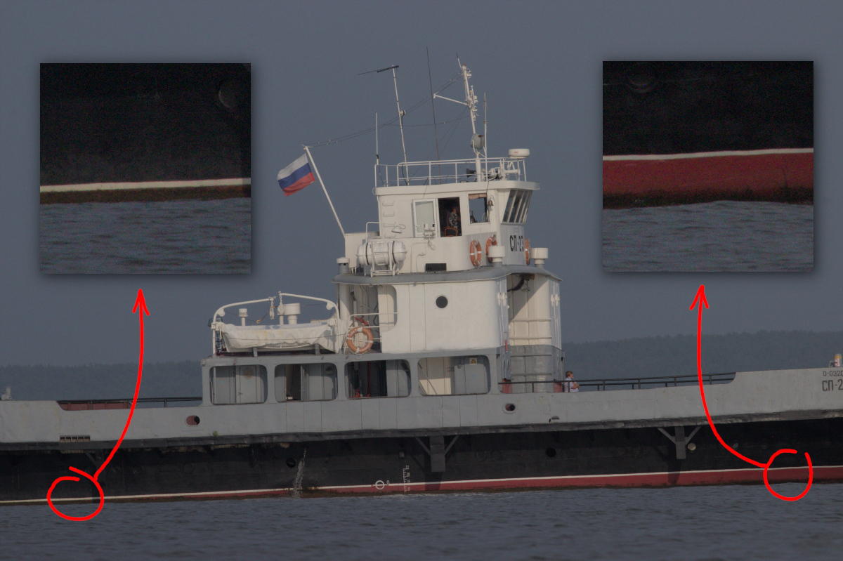 Фотография №1. Судно находится максимально близко к месту съёмки. Можно зафиксировать внимание на отдельных деталях, за которыми будем далее наблюдать. Я выбрал ватерлинию судна для наблюдения. На всём корпусе линия видна чётко.