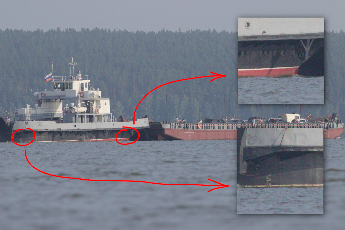 Фотография №6. Паром дошёл до причала на противоположном берегу. Ватерлинию не наблюдаю. Границу линии отражения не могу определить.