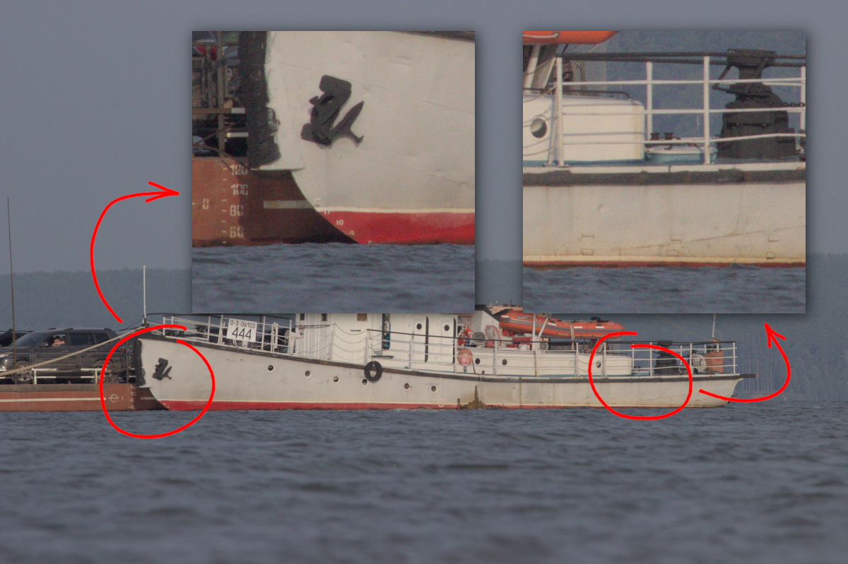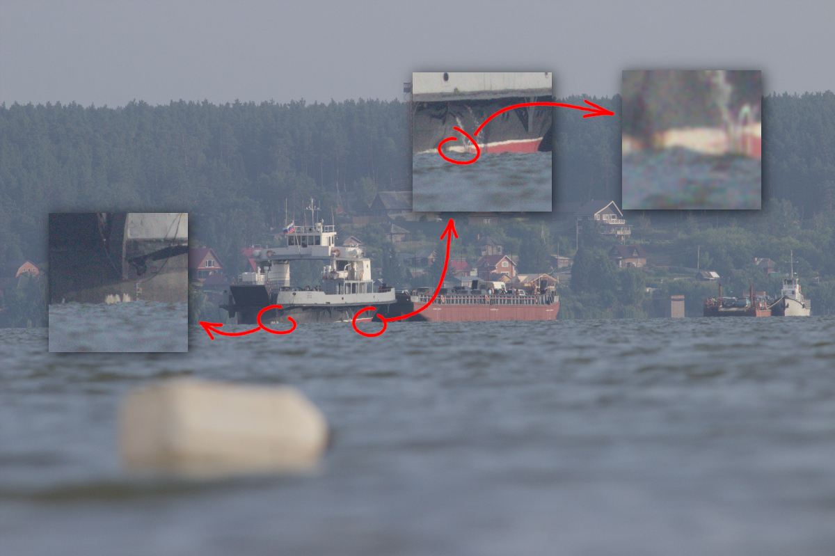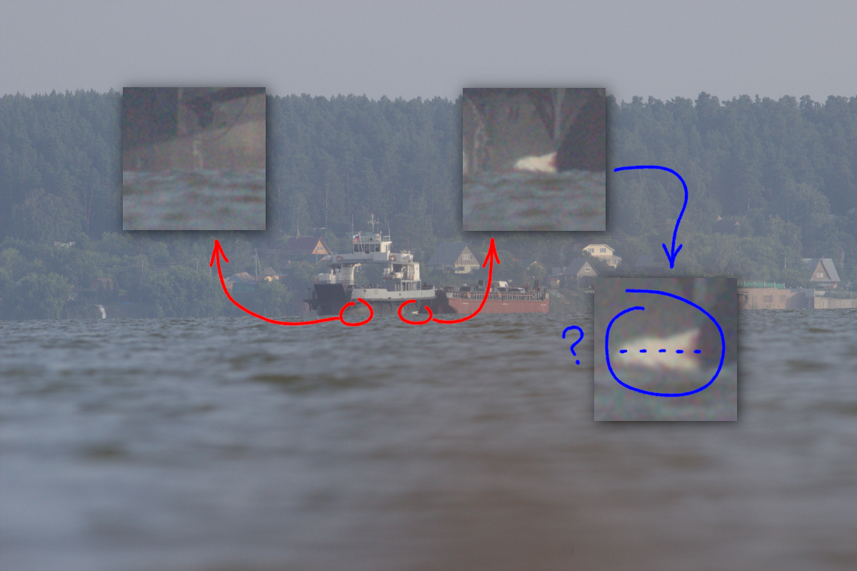 Фотография №3. Наблюдаю только часть ватерлинии судна. Так же начинаю наблюдать ещё один эффект. Пока не явно. Это напоминает какое-то отражение. Как будто от воды.