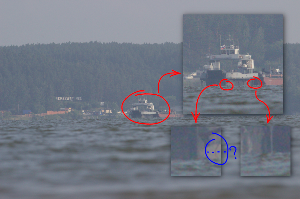- Так же наблюдается эффект отражения от воды. Возможно это ещё один фактор, который помешал наблюдать искривление на Новосибирской ГЭС с расстояния 8 км.
