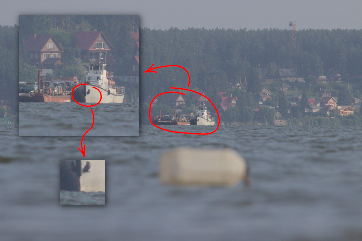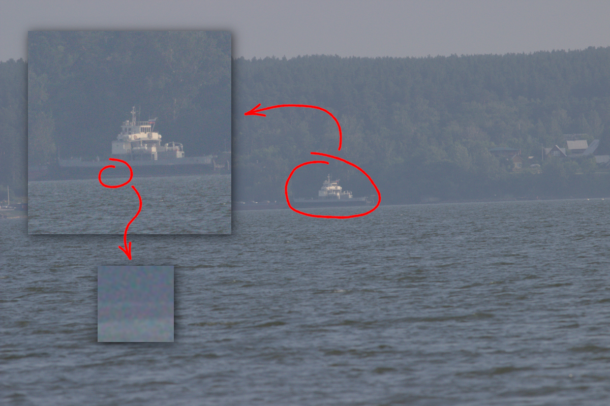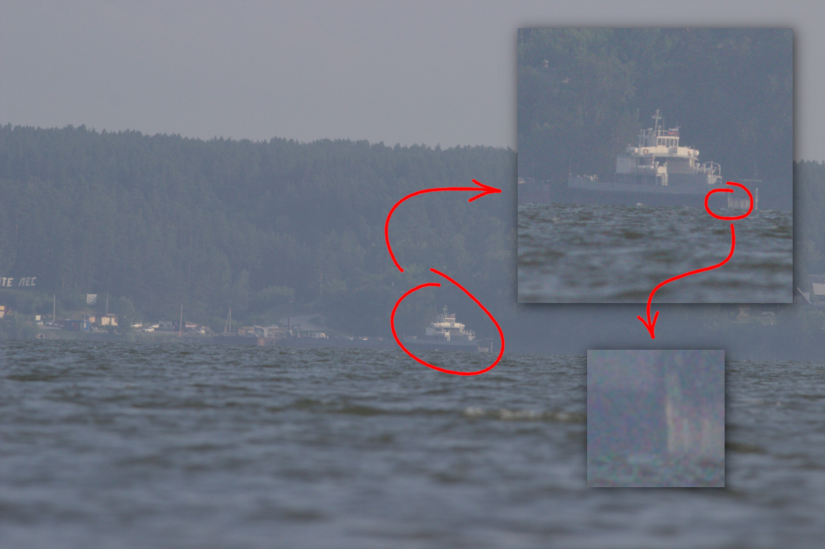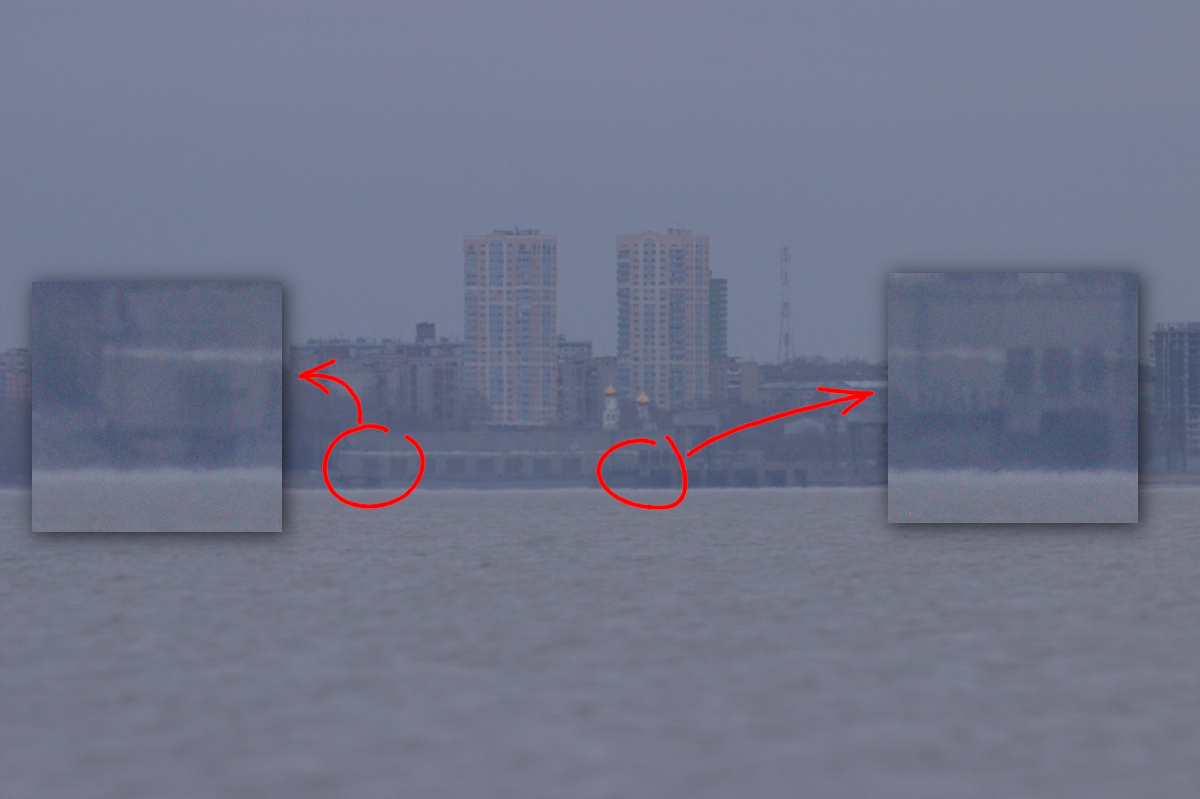 - Слишком большое расстояние (7-8 км) для имеющейся в моём распоряжении оптики, из-за чего было недостаточно деталей для наблюдения. От большого расстояния наблюдались большие искажения из-за так называемого марева — колебаний воздуха.
