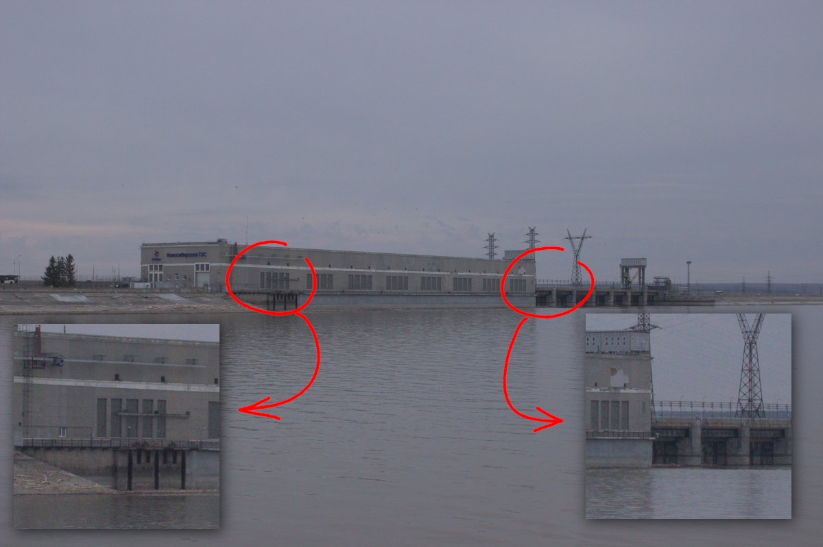 - Само здание ГЭС с машинным залом в своей форме имеет много вертикальных форм и мало горизонтальных около уровня воды. Детали на высоте не считаются, так как не помогают с проверкой. Вертикальные формы отражаются от водной поверхности дающей эффект зеркала.